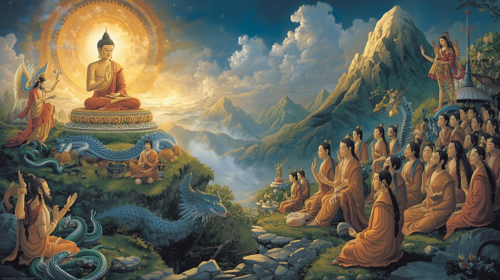 - 六瑞相(徵兆):佛陀放眉間光、雨花、地動、天鼓鳴等六種稀有瑞相,預示將講述殊勝的《法華經》。