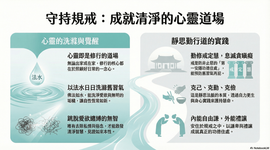 - 規戒為首: 在道場中,身心皆為道,規戒是第一要素。心淨念純,自然能安穩於規戒之中。