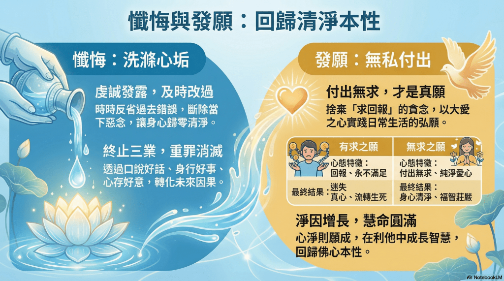 - 核心啟示: 真誠且無求的付出,能自然感得福智莊嚴與淨因增長,無需外求。