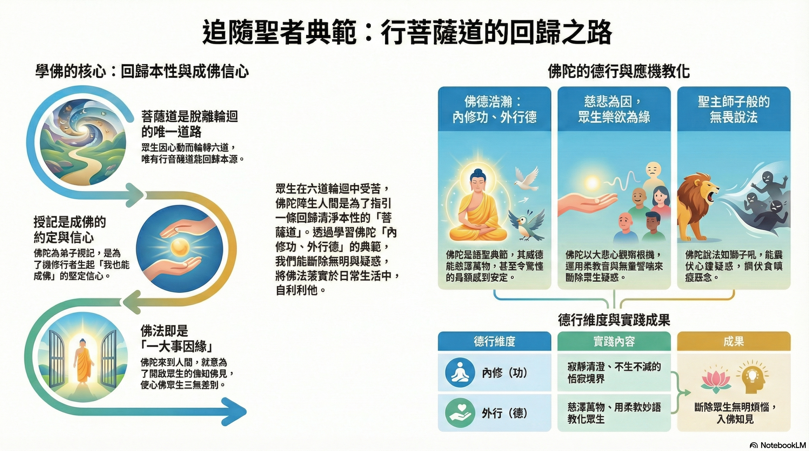 - 學佛的內涵:學佛者應以佛為典範,學習其「內修的功,外行的德」,將佛陀過去的修行作為自身實踐的藍圖。