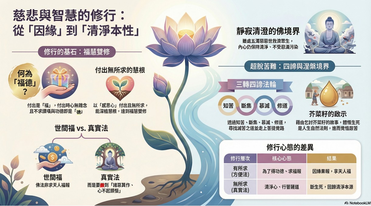 本開示深刻指出,修行的關鍵不在於外在的布施形式,而在於內心的「無執」與「無求」。從理解「苦」的共相開始,修行者應藉由佛陀提供的種種因緣與譬喻,轉化畏懼因果的被動心態為追求本源佛性的主動覺悟。真正的解脫並非逃避世間,而是在紛擾的惡濁現實中,保持一份不生不滅、不受染著的清淨心境。